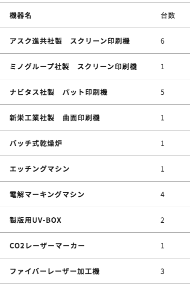 株式会社ミヤニシでは、エッチング加工、金属印刷、樹脂印刷、レーザー彫刻における高度な加工技術を支えるため、最先端の設備を導入しています。多様な素材や複雑なデザインにも対応できるよう、最新の機械と熟練した技術者が連携し、精密かつ高品質な仕上がりを実現。お客様の製品に最大限の価値を提供するため、日々設備の改善・更新を行い、さらなる技術向上を目指しています。